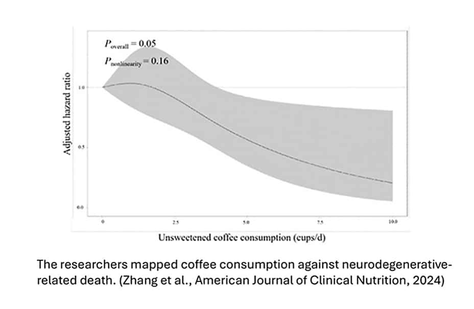 En büyük istatistiksel bulgu son grupta bulundu. Genel olarak, kahve içmeyenlere kıyasla, herhangi bir miktarda kahve içenlerin Alzheimer hastalığı ve ilgili hastalıklara yakalanma olasılığı en az %34, Parkinson hastalığı geliştirme olasılığı %37 ve çalışma sırasında nörodejeneratif bir hastalıktan ölme olasılığı %47 daha azdı.